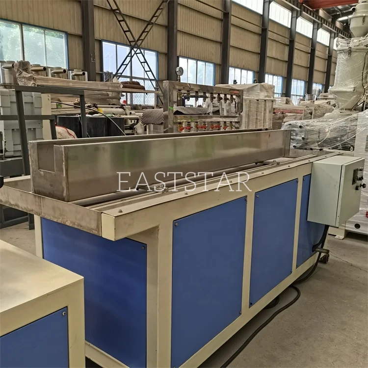 Multi-scaena refrigerandi et figurandi fabrica in amni linea productionis installatur. Aquam temperatura praecise moderante et rate fluunt, PVC extrema ligatura cito formatur et formam suam retinet, relicta forma. Diligens tractus mechanismum praebet vim lenis trahendi ne extensio et deformatio. Ad PVC limbum ligamen cum specialioribus superficiei requisitis, linea etiam instrui potest cum modulis ad libitum embossandis, imprimendis, vel efficiendi modulis ad varios effectus decorativos consequendos, ut exemplum ligni grani et lapidis.