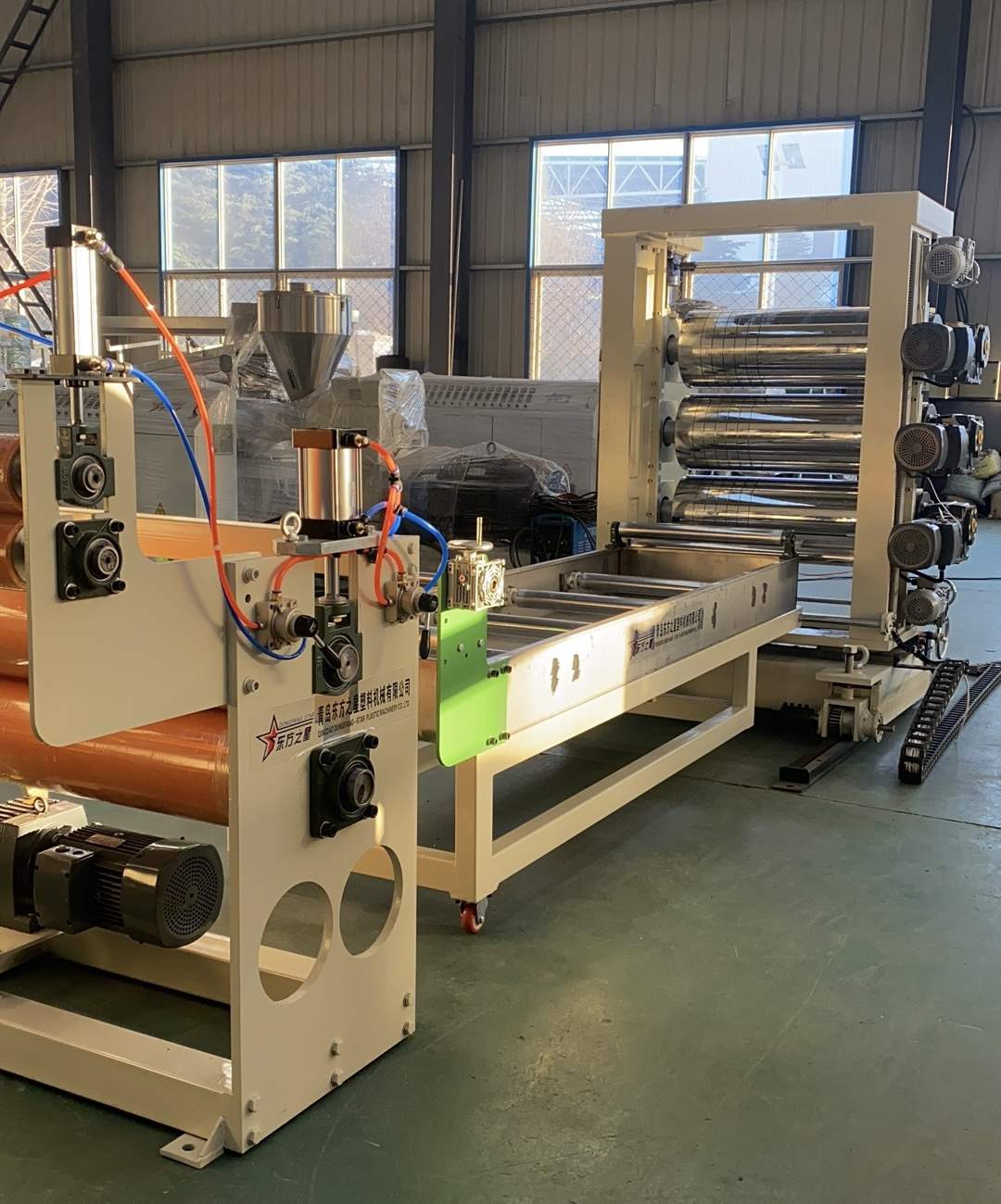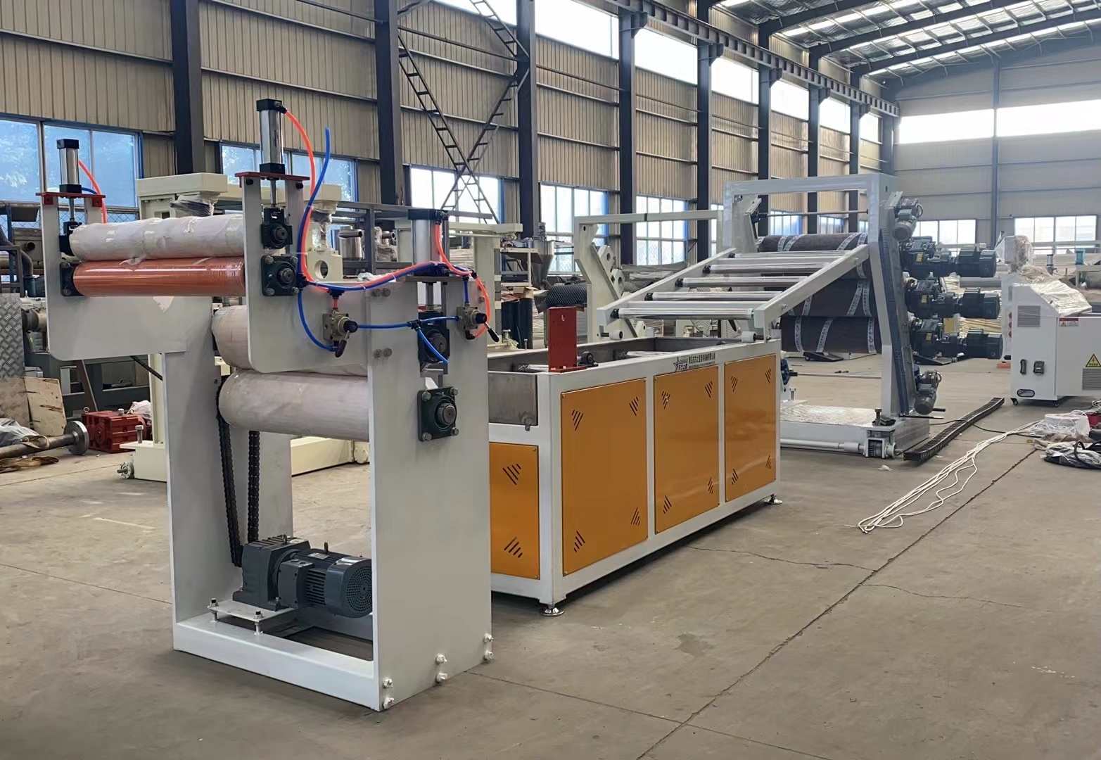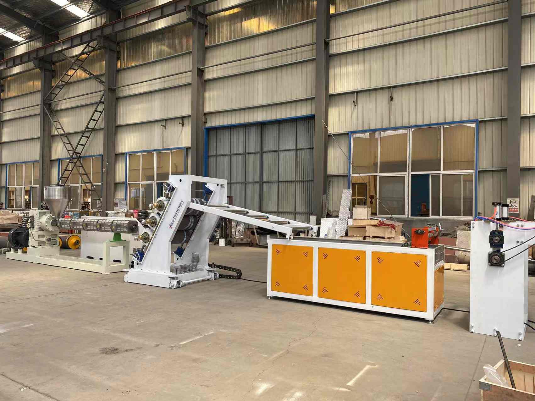 Productio Linea pro PVC Transparens vela mollia: Capax ad PVC perspicuas plasmata plastica producendi cum latitudine vndique ab 200 ad 600 millimetris et crassitudine 0,8 ad 3 millimetris. Apparatus involvit SJ90 vel SJ-120 unum cochleae extrudoris, aptabilis T informibus flexilis mori, verticalis vel 45 gradus inclinatus trium cylindrorum fastorum, trium in unum aquae temperaturae moderatoris, ferrum immaculatum refrigerandum bracket instructum cultro torulo lato lato aptabili, globulus cylindrus tractus machinae et duplicatus expansus aëreus. Plagulae productae superficiem habent nitidam, diaphaneitatem, mollitiem, non rimas, nullum odorem, nullas bullas, flexibiles, frigorae obsistens, obsistentes, acid-alcali resistentes, et corrosio repugnantes.